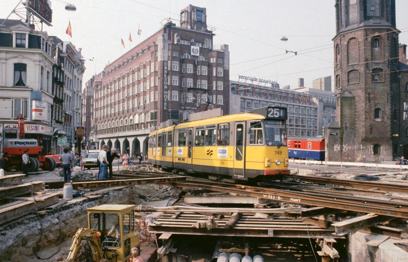 Vernieuwing van de brug op het Muntplein op 8-5-1985, lijn 25 - 749
